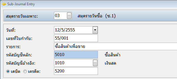 ขั้นตอนที่ 1 บันทึกที่สมุดรายวันซื้อ โดยเลขที่บัญชีที่อ้างอิงให้อ้างอิงกับรหัสบัญชีเงินสด และด้านลงปกติให้กำหนดเป็น 1 (เดบิต) จำนวนเงินที่บันทึกคือ 5,200 บาท