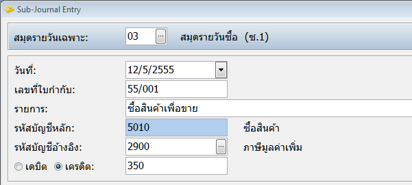 ใช้โปรแกรมบัญชีแยกประเภทเพียงโปรแกรมเดียว โดยกำหนดสมุดรายวันเฉพาะซื้อขึ้นมา 1 เล่ม และบันทึกรายการซื้อที่สมุดรายวันเฉพาะซื้อ ซึ่งรายการที่ซื้อ จะมีภาษีมูลค่าเพิ่มและมีภาษีหัก ณ. ที่จ่ายด้วย แต่ไม่สามารถบันทึกรายการได้ เพราะโปรแกรมให้บันทึกรายการเพียงแค่ 2 รายการเท่านั้น ไม่ทราบว่าจะมีวิธีการบันทึกรายการผ่านสมุดรายวันเฉพาะซื้ออย่างไร โดยที่ไม่ต้องไปบันทึกรายการผ่านสมุดรายวันทั่วไป เช่น รายการที่เกิดขึ้นคือ
