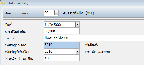 ขั้นตอนที่ 3 บันทึกที่สมุดรายวันเฉพาะซื้อ โดยอ้างอิงกับบัญชีภาษีหัก ณ. ที่จ่าย ด้านลงปกติกำหนดเป็น 1 (เดบิต) จำนวนเงินที่บันทึกคือ 150 บาท