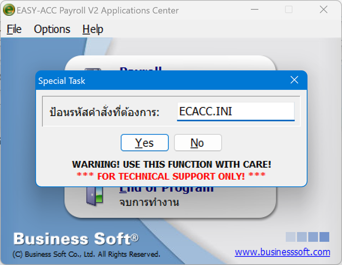 ในกรณีที่นพนักงานที่ปฏิบัติงานในกิจการอายุเกิน 60 ปี และต้องการให้โปรแกรมคำนวณเงินประกันสังคมด้วย ให้แก้ไขดังนี้ พนักงานอายุเกิน 60 ปีต้องการคำนวณประกันสังคม1) จากเมนูหลักให้กด Alt+F9 ใส่คำสั่ง ECACC.INI แล้วคลิก Yes