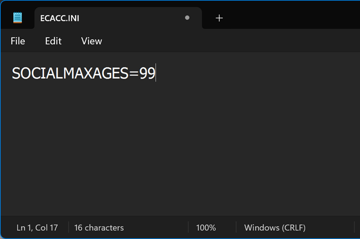 2) เพิ่ม Parameter SOCIALMAXAGES=99 แล้วคลิกที่ File > Save