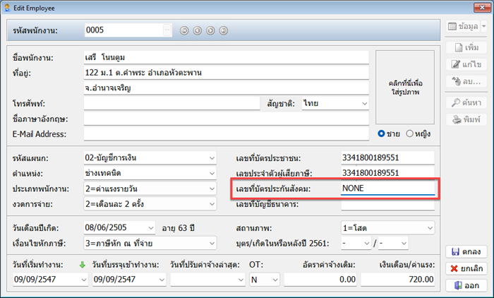 3) กรณีที่ท่านมีการคำนวณเงินประกันสังคมไปก่อนหน้าที่จะแก้ไข Parameter นี้ ให้ยกเลิกการคำนวณ แล้วทำการคำนวณประกันสังคมใหม่ โปรแกรมจึงจะคำนวณประกันสังคมให้ พนักงานอายุเกิน 60 ปี ไม่ต้องการคำนวณประกันสังคมกรณีที่ไม่ต้องการคำนวณเงินประกันสังคมสำหรับพนักงานที่มีอายุเกิน 60 ปี ให้ทำตามขั้นตอนดังนี้ 1) ไปที่รายการ Update > เพิ่มแก้ไขแฟ้มพนักงาน ใส่รหัสพนักงานที่ต้องการ 2) ในช่องเลขที่บัตรประกันสังคม ให้ใส่ NONE แล้วคลิก ตกลง